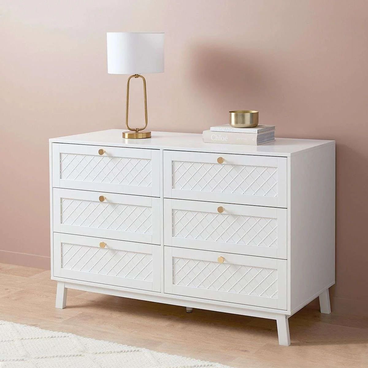 The Genevieve Six Drawer is the perfect combination of classic and traditional design, with a hint of Hamptons criss-cross detailing on the front drawer panels. Each drawer is adorned with a round, gold handle that is bang on-trend and gives this drawer a touch of chic glamour.